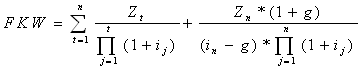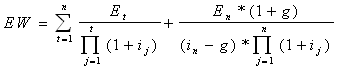 Diese Formel berücksichtigt jedoch noch kein Risiko. In folgender Formel wird davon ausgegangen, daß das Wachstum ab der Periode n gleich Null ist und das Risiko (?-?) im Zähler des Ertragswertes berücksichtigt wird. Außerdem wird zur Vereinfachung der Formel von konstanten Zinssätzen im Prognosezeitraum ausgegangen.