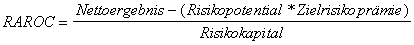 Diese Kennzahl ist eine Erweiterung der Kennzahl RORAC. Je nach Datengrundlage des Unternehmens kann man verschiedene Methoden verwenden, um den RAROC zu berechnen. Die wohl am weitesten verbreitete Methode ist die VaR-Methode. Nach dieser Methode wird der RAROC mit folgender Formel berechnet.