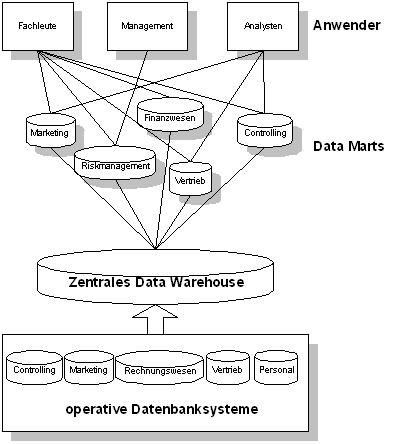 Bei diesem Konzept gibt es wieder zwei verschiedene Entwicklungsrichtungen. Während die eine Entwicklung in die Richtung geht, daß im ZDW nur Daten der höchsten Granularität gespeichert werden und keine aggregierten und konsolidierten Daten, geht die andere Entwicklung in die Richtung, daß im ZDW auch aggregierte und konsolidierte Daten gespeichert werden. Die erste Entwicklung hat den Vorteil, daß nicht so viele Daten repliziert werden müssen und dadurch Speicherplatz gespart wird. Der Nachteil liegt, wie beim Data Basement darin, daß der Anwender wissen muß, in welchem Data Mart welche Daten gespeichert sind. Die zweite Entwicklung hat den Vorteil, daß die gesamte Datenbasis konsistent ist, so daß Abfragen auf die einzelnen Data Marts die gleichen Ergebnisse liefern müssen, wie Abfragen auf das ZDW. Diese Architektur wurde auch im Kapitel „Architektur und Komponenten des Data Warehouse“ ausführlich beschrieben und stellt das am weitesten verbreitete Konzept dar.