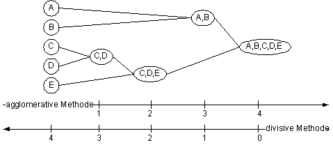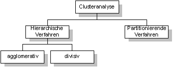 Die Clusteranalyse läßt sich in zwei verschiedene Methoden teilen. Dabei unterscheidet man die hierarchische Verfahren und die partitionierenden Verfahren.87 Die hierarchischen Verfahren kann man wiederum, je nach Vorgehensweise, in zwei Gruppen unterteilen. Aus den einzelnen Daten wird bei der agglomerativen Methode versucht, schrittweise Gruppen zu bilden. Dabei werden bei jedem Schritt jeweils zwei Gruppen zusammengefaßt. Die divisive Methode versucht im Gegensatz zur agglomerativen Methode die ganze Datenmenge in einzelne Gruppen zu teilen. Das Ziel beider Verfahren ist, die Datenmenge in k Klassen zu teilen.