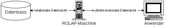 ROLAP-Werkzeuge basieren auf einer mehrdimensional-relationalen Datenhaltung. Dabei wird die multidimensionale Datensicht auf ein relationales Datenmodell abgebildet. Für die Umsetzung der Benutzer-Operationen (von multidimensionaler Sicht auf relationale Sicht) bedient man sich einer ROLAP-Maschine, welche mit Hilfe von dynamisch generierten SQL-Befehlen bewerkstelligt wird. Bei diesem Vorgang wird die bereitgestellte Funktionalität des DBMS genutzt.