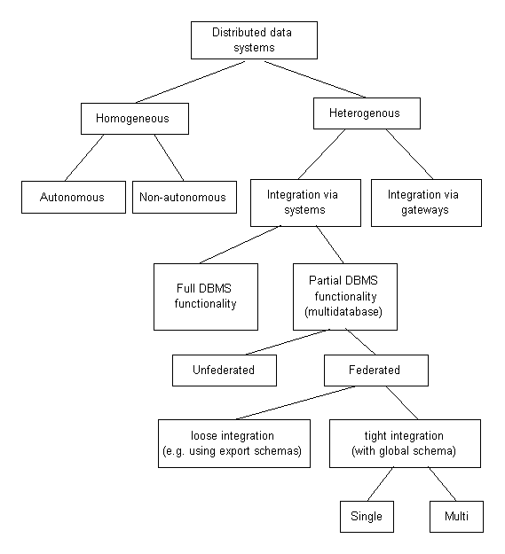 Die heterogenen Systeme kann man in zwei Teilklassen unterscheiden. Einmal kann das System durch die völlige Integration durch das System selbst zusammengehalten werden, andererseits kann man durch gateways Verbindungen zu anderen Systemen herstellen. Erstere unterscheidet man wiederum in Full und in Partial DBMS functionality. Die Klasse der Partial DBMS functionality nennt man auch „multidatabase“ (MDB) und unterteilt man wiederum in federated und unfederated MDBMS, wobei die unfederated MDBMS kaum eine Rolle spielen, da diese keine lokalen Anwender unterstützen und somit dubios sind4. siehe auch: Föderierte Datenbanksysteme